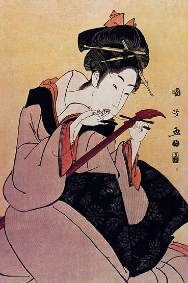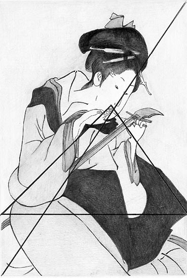 Kacušika Hokusai: Dievča vymieňajúce struny na hudobnom nástroji samisan